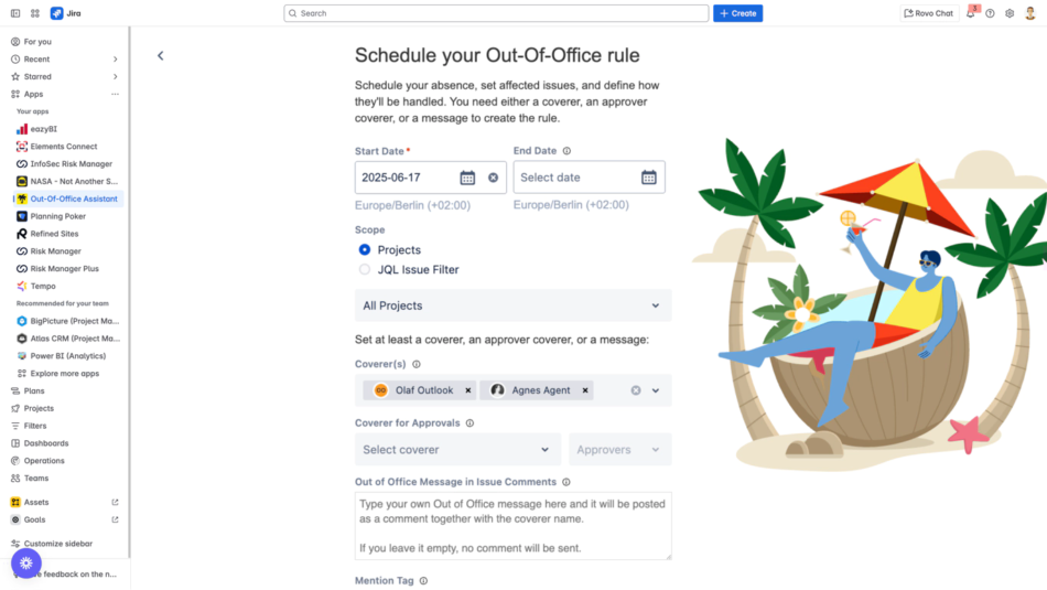 This guide provides detailed instructions for setting up and managing coverers in Out of Office Assistant. Coverers are colleagues who automatically receive issue assignments when you’re away from work, ensuring continuous project progress and customer service.