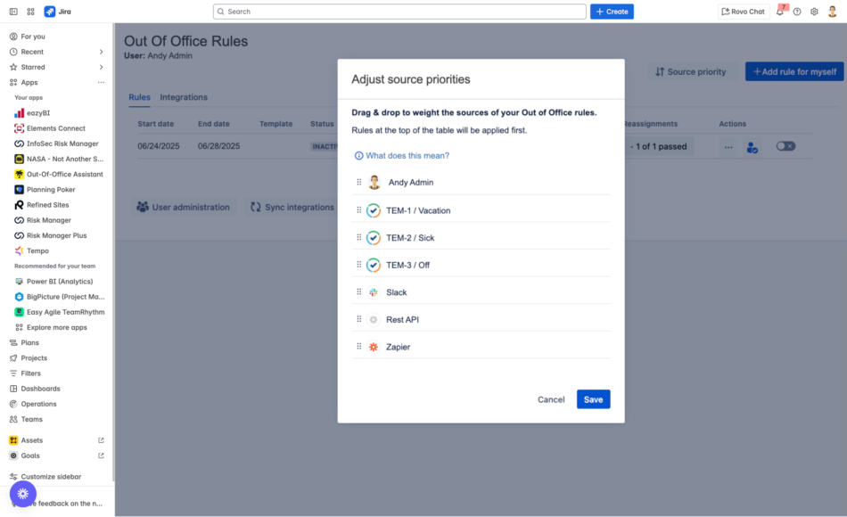 Out of Office Assistant provides sophisticated rule prioritization and conflict resolution mechanisms to ensure the right absence rules apply when multiple rules could affect the same issue. This feature becomes essential when using multiple integration sources (Manual, Slack, Outlook, Tempo) or when rules have overlapping scopes, preventing confusion and ensuring predictable behavior in your absence management.