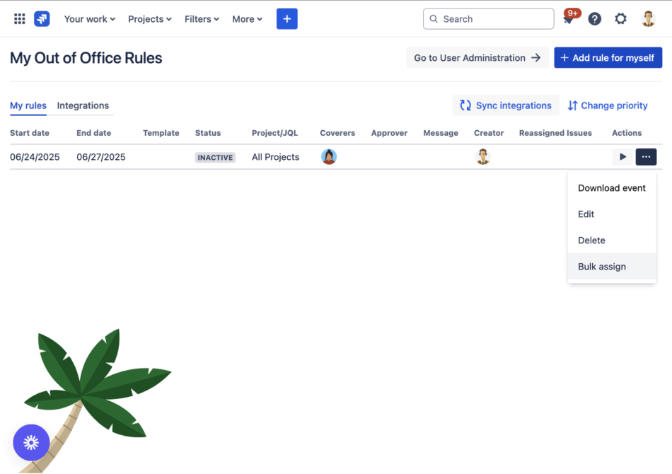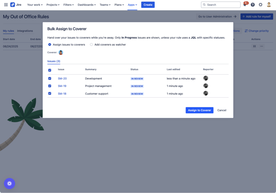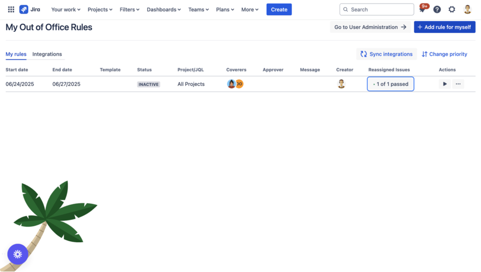The Rules Management Interface is the central hub for viewing, creating, and managing all Out of Office rules in your Jira instance. This comprehensive dashboard provides real-time visibility into active absences, scheduled time off, and historical rule performance, enabling effective absence management and team coordination.