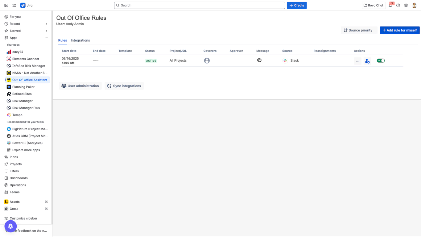 When you navigate to Jira, you will find the Out of Office rule listed alongside all other rules. The rule can also be modified in this list, and any changes will be reflected in Slack.