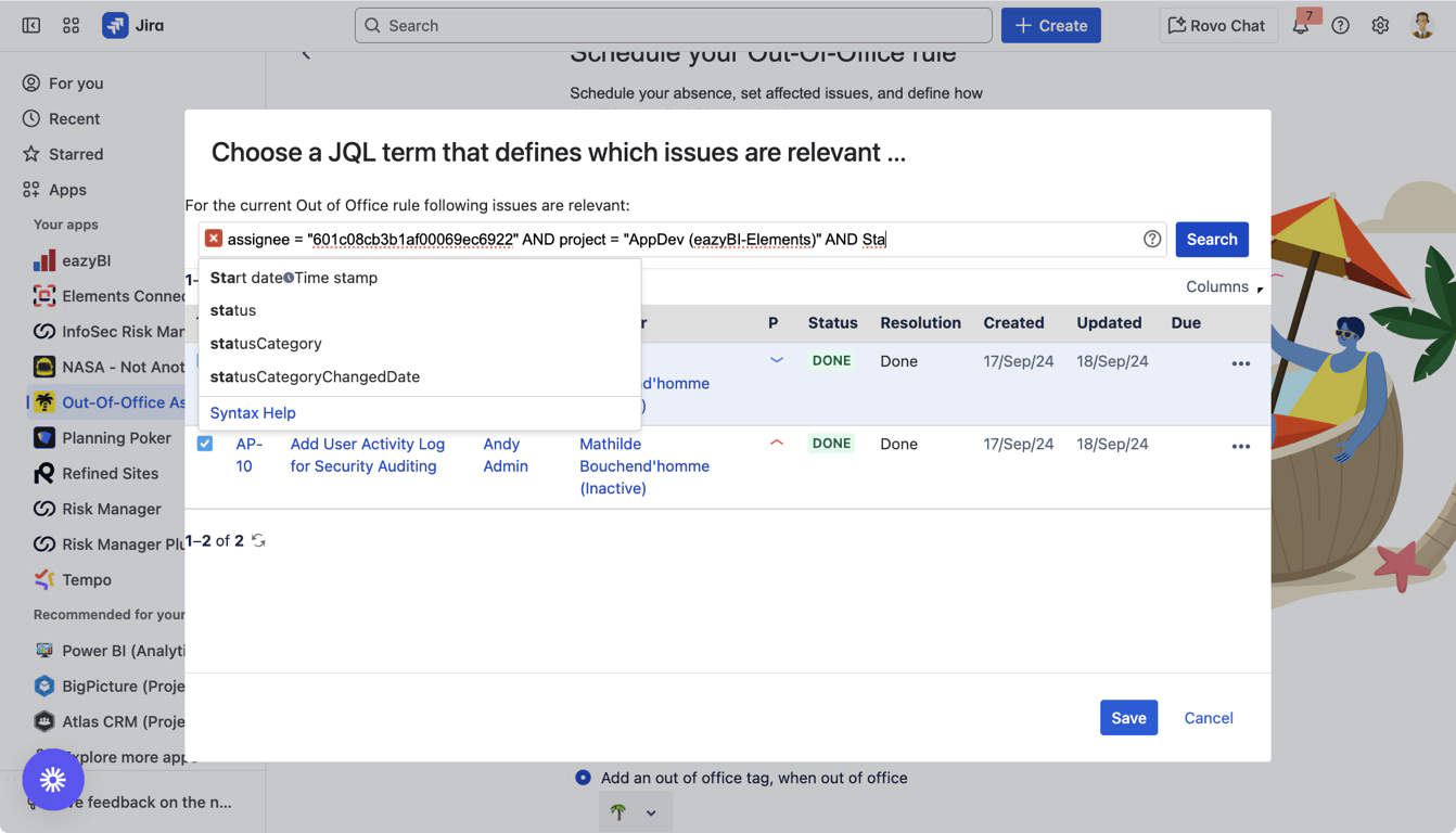 JQL (Jira Query Language) filters provide powerful and precise control over which issues are affected by Out of Office Assistant rules. Instead of targeting all projects or manually selecting specific projects, JQL filters allow you to create sophisticated targeting criteria based on any combination of Jira fields, conditions, and relationships.