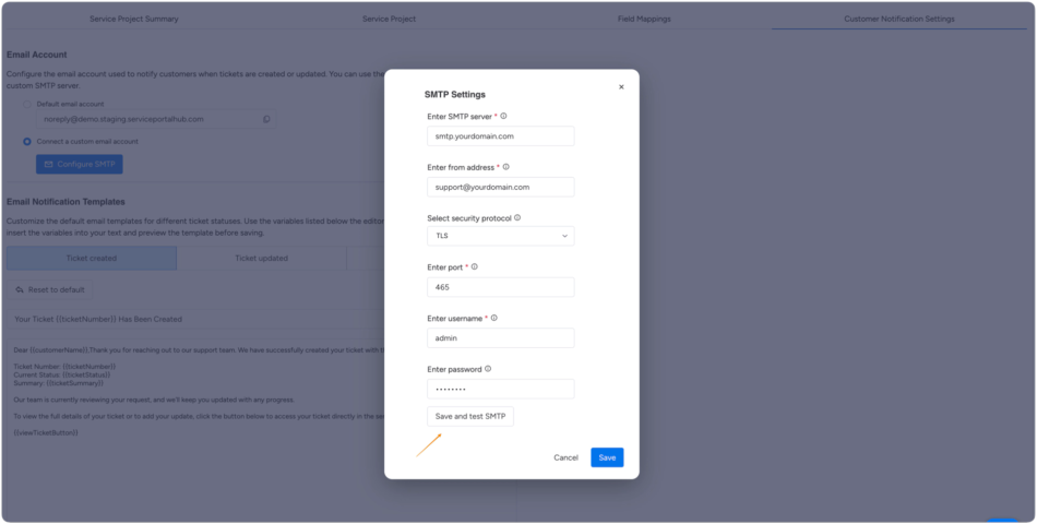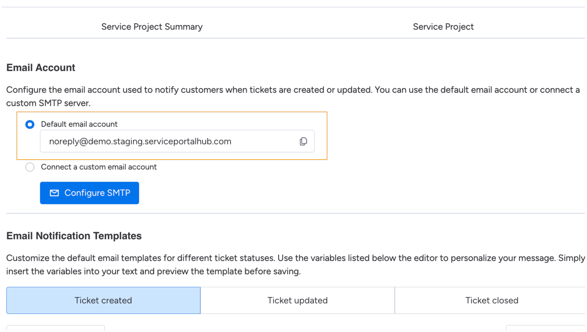 At the top: the sender address. It’s based on the subdomain you configured earlier in the Email Account section (e.g. noreply@yourdomain.serviceportalhub.com).