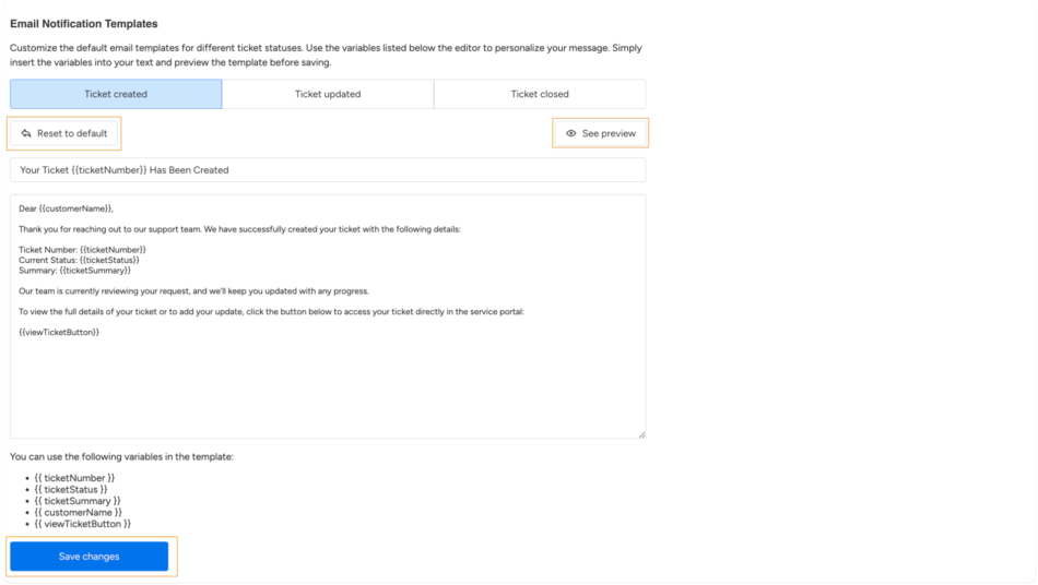The blue button ({{viewTicketButton}}) links the customer straight to the service portal and the created ticket.