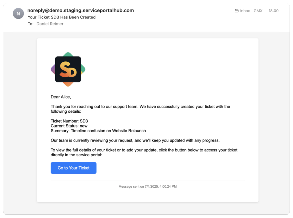 The Service Desk App sends notification emails to keep customers informed about ticket activity, like when a ticket is created, updated, or closed. These emails are one-way notifications only.