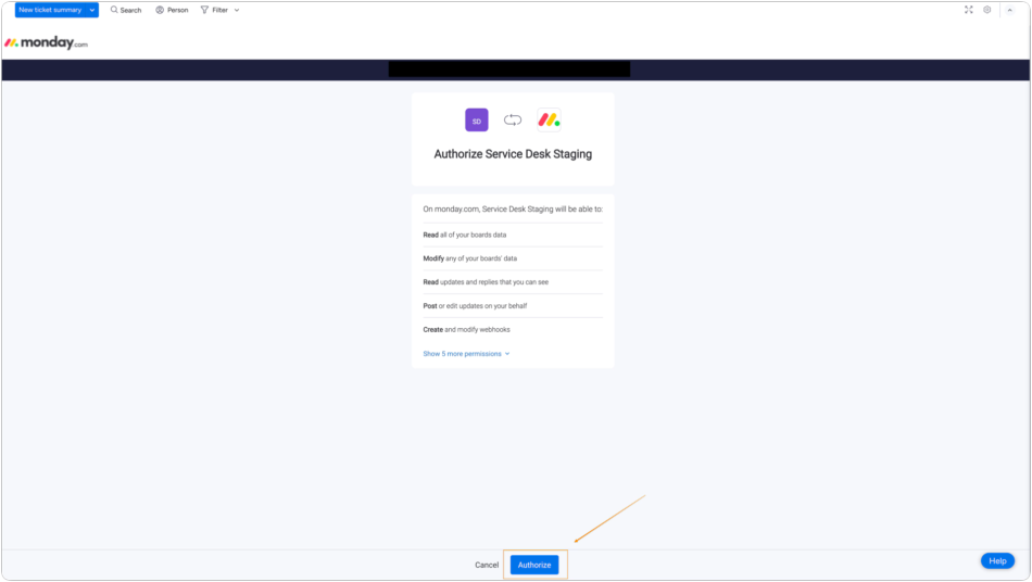 When opening the Service Desk app view on a board for the first time, a dialog will prompt you to authorize the app.